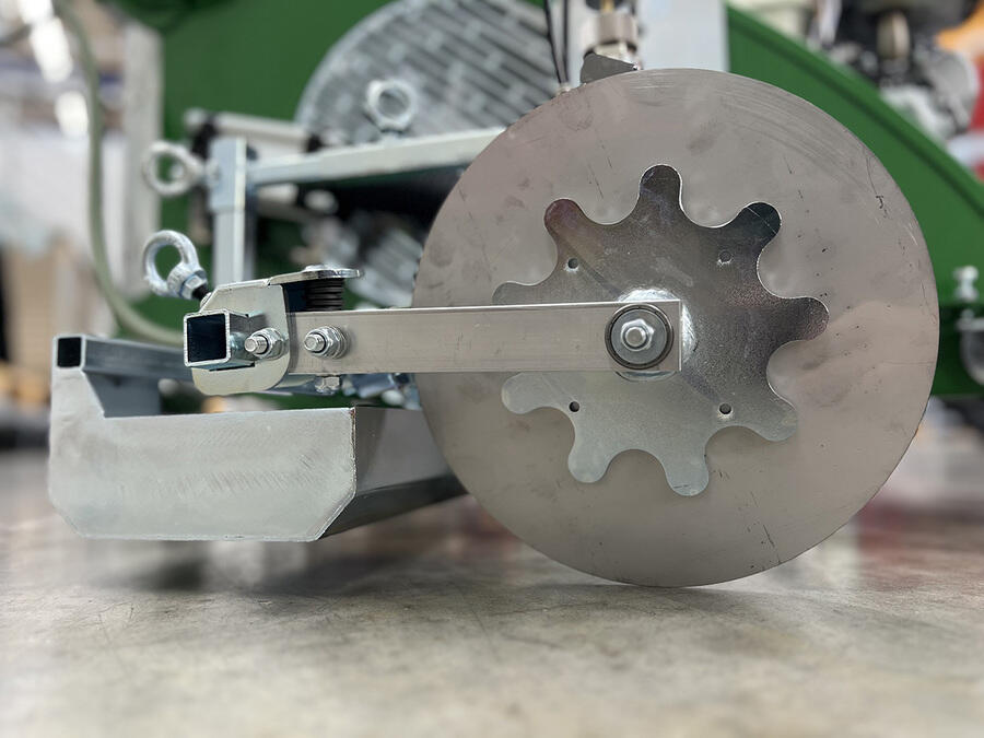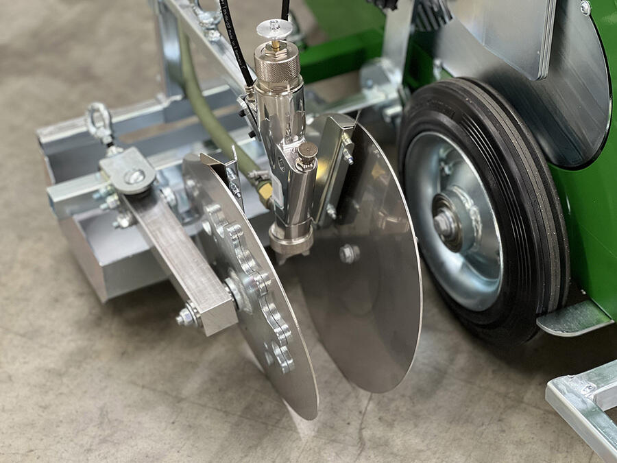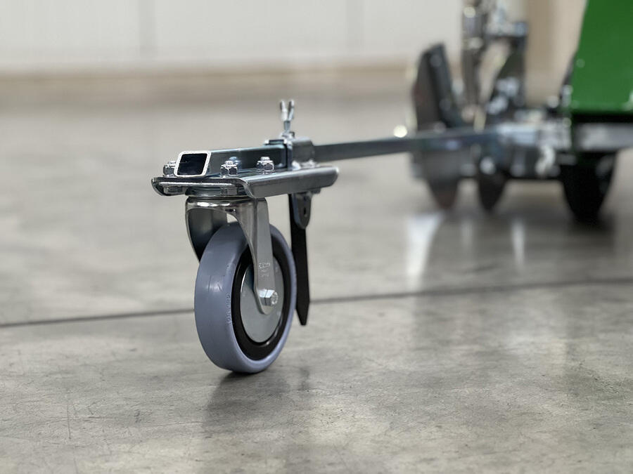 On athletics tracks, smooth running is ensured through solid-rubber tires with precision bearings. To provide exact guidance for striping on artificial turf, an optional star wheel can be supplied.
