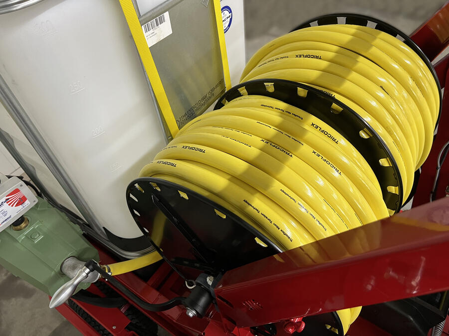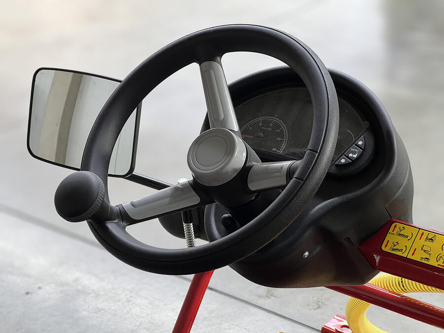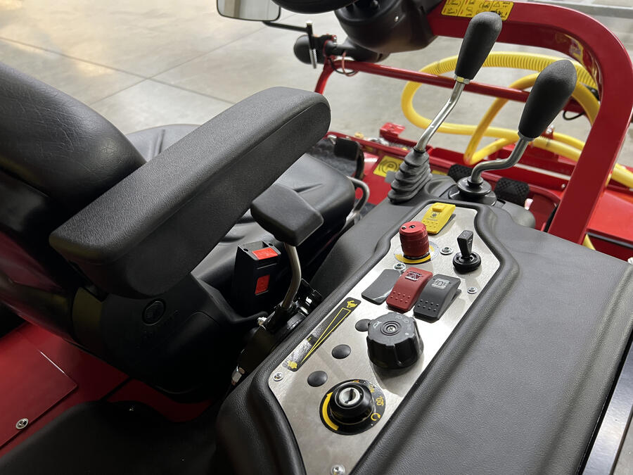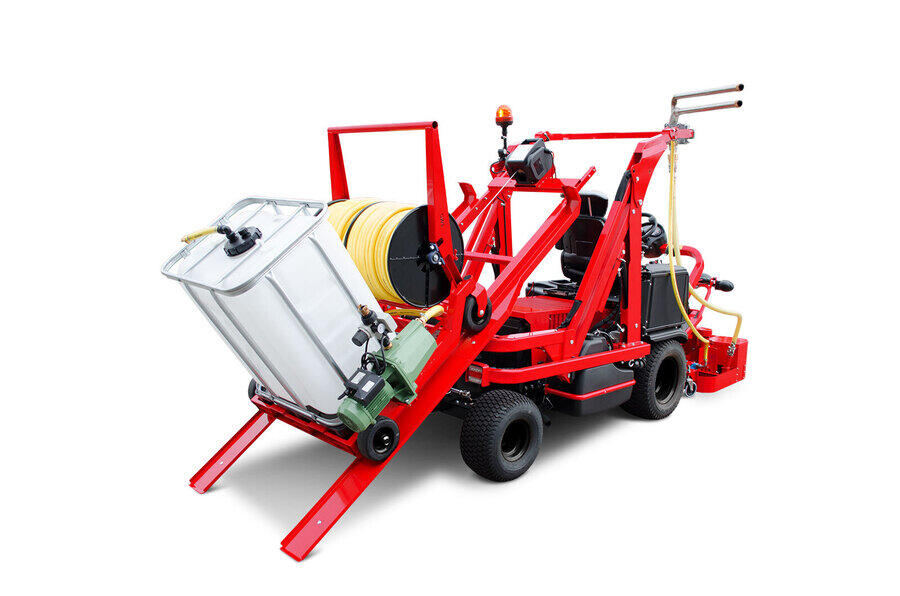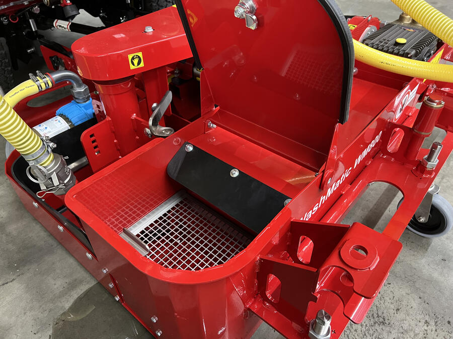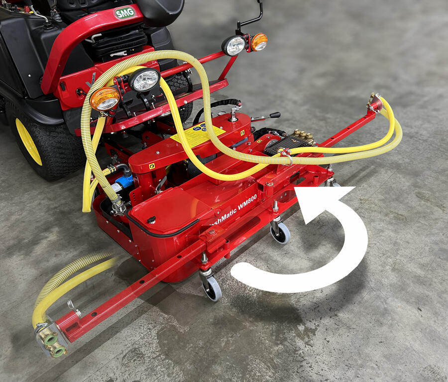 The WashMatic is powered by a 18,2 kW (24,7 HP) water-cooled diesel engine. The front attachment cleans synthetic sports surfaces, e.g. nonfilled artificial grass, jogging tracks, multi-purpose playing fields or similar surfaces by high pressure water. The spray pressure can be adjusted up to 140 bar. The patent-pending front attachment gently cleans the sports surface with eight rotating high-pressure nozzles arranged at an angle.