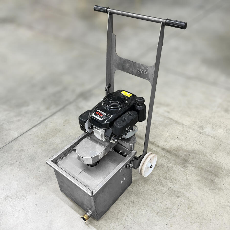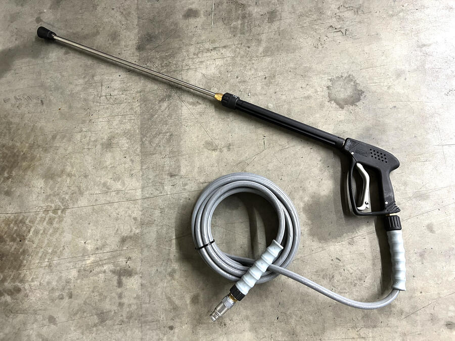 The dirty water is discharged via a drain hose. The working width of the WM800 is 800 mm; 200m² - 250m² can be cleaned per hour. The 300 liter water tank, external pump and hoses are placed on a compact trolley. This can be easily lowered by a electric winch over the ramp and positioned as needed. The scope of delivery includes 2 hoses (each 75 m) and 1 hose (10 m) for working on edge areas with the hand lance.
