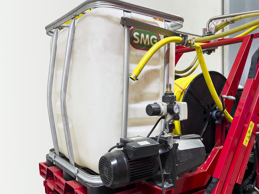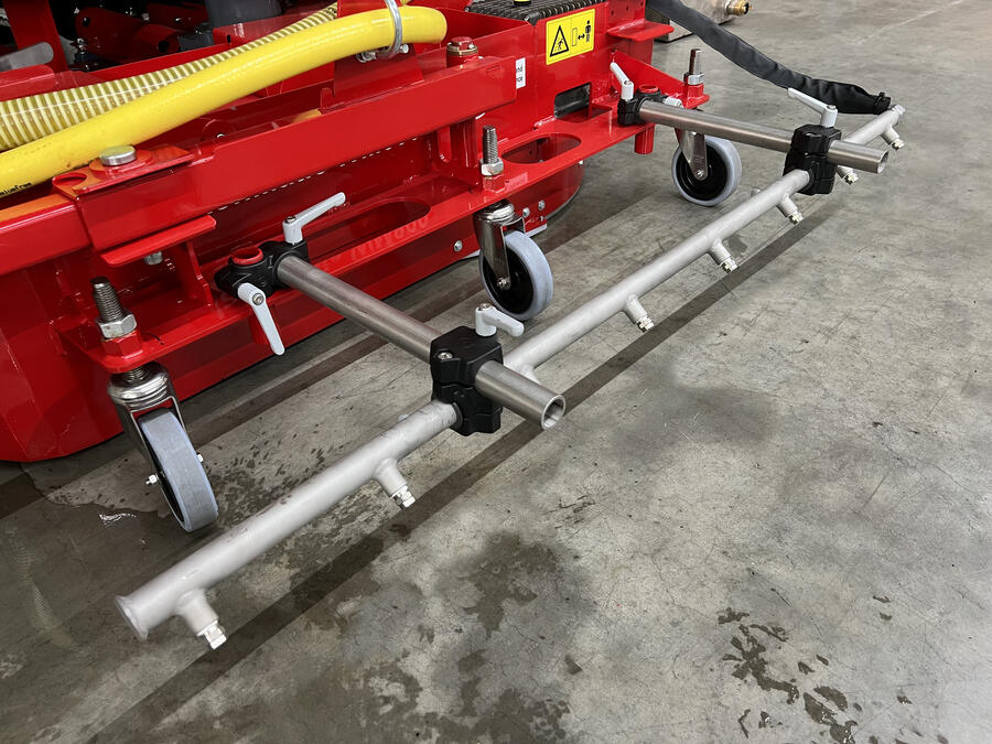 The applied water and organic contamination as well as granulate/fibre abrasion (microplastics) are suctioned off the sports surface with high efficiency using the fast rotating blades of the WashMatic and conveyed to a waste water pump. The water requirement per minute is 50 liters and is usually provided by the water supply of the sports facility. If the required amount of water is not available, the 300 liter water tank with integrated overflow valve can be used as a water buffer. In this case, an external water pump requests the fresh water from the intermediate tank to the machine.